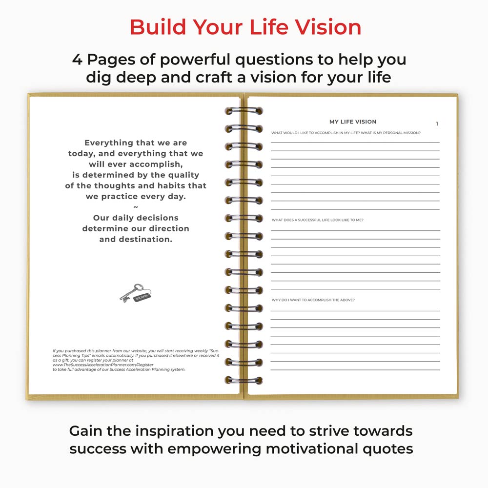 The Success Acceleration Planner is specially designed to guide you in describing your dreams and life vision, then creating goals that will get you there and help you stay on track twice a day, every day, week, and month. Designed by a business executive who spent more than a decade figuring out what works and what doesn’t in helping people succeed in their professional, business, and personal lives and in feeling satisfied and fulfilled, this is the most sophisticated Planner you will ever find.